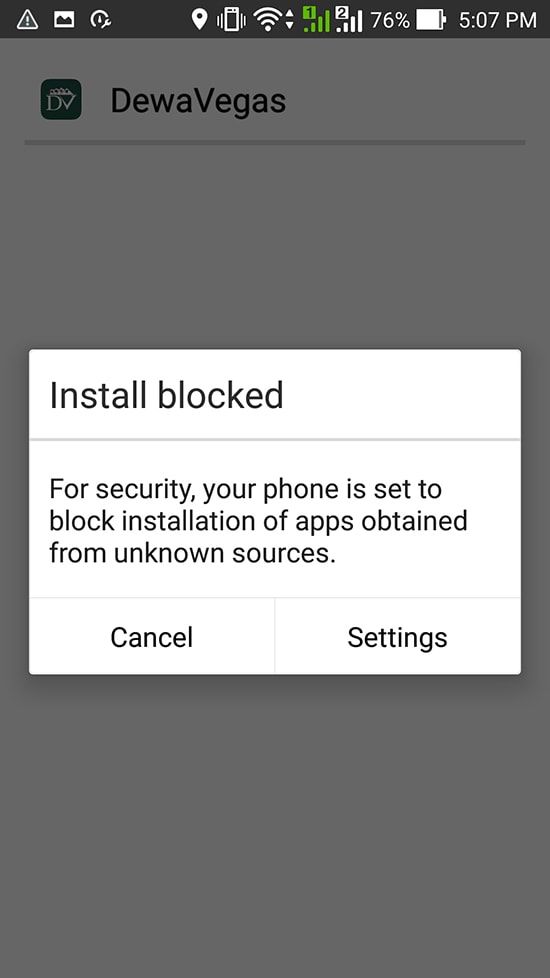 2. Jika sudah selesai, klik dan install langsung file dewavegas.apk, jika muncul keterangan Install Blocked, Pilih dan Klik “Settings”, setelah itu pilih “Unknown Source” di bagian “Security”, Centang/Klik pada bagian seperti yang dilingkari pada gambar dibawah ini.